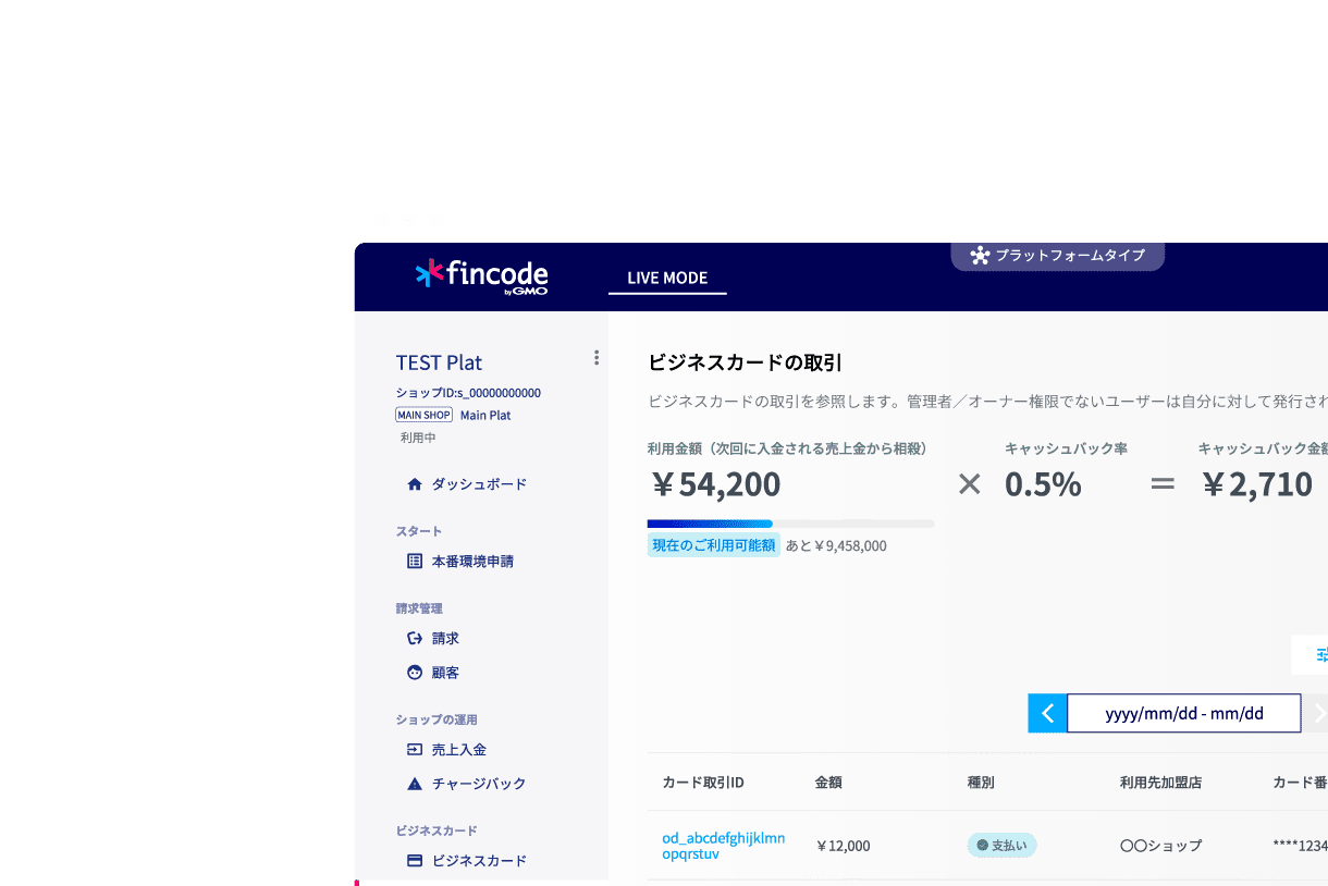 企業や個人事業主が事業に関わる支払いに利用する売上連動型Visaカードです。広告出稿や仕入れに利用したり、諸経費の支払いに使用するなど様々な資金ニーズに柔軟に対応できます。fincode ビジネスカードはショップの売上金の入金日を待たずに各種お支払いにご利用いただけるのが特徴です。