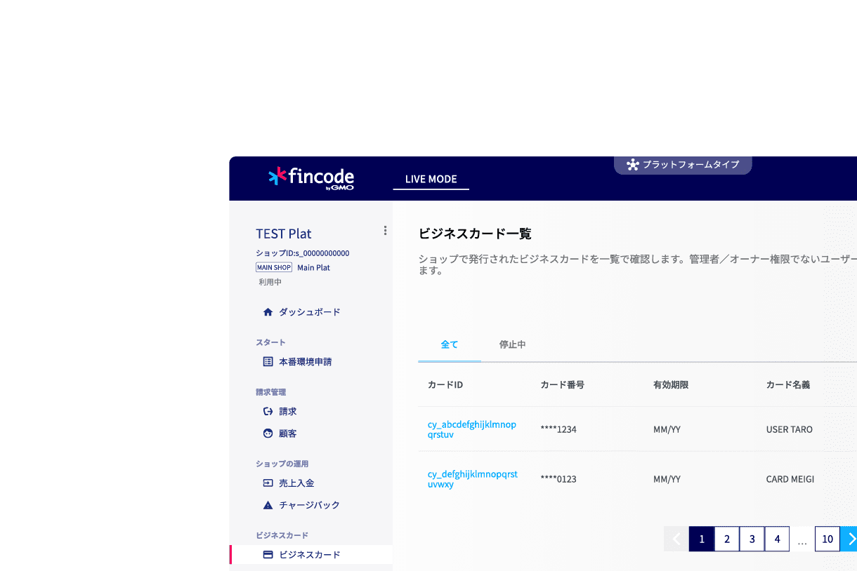 ショップで発行されたビジネスカードが一覧で確認でき、カードごとの取引履歴の確認も可能です。カードの停止や有効化、削除などの状態の更新もこちらで実施します。オーナー/管理者ロールではないユーザーは、自分に対して発行されたカード情報のみ参照可能となります。